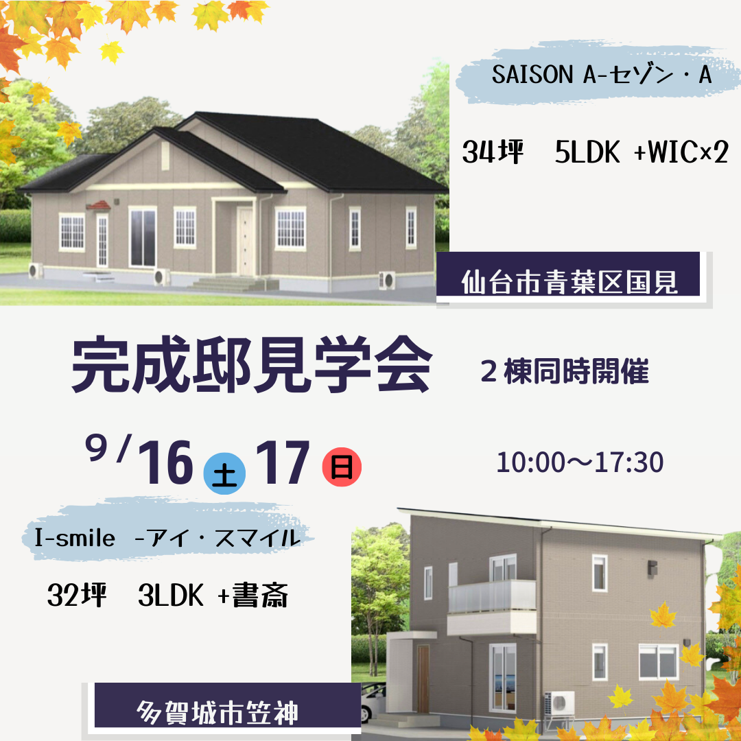 9月16日(土)・17日(日)2会場同時開催 仙台市青葉区国見・多賀城市笠神【完成邸見学会】のお知らせ